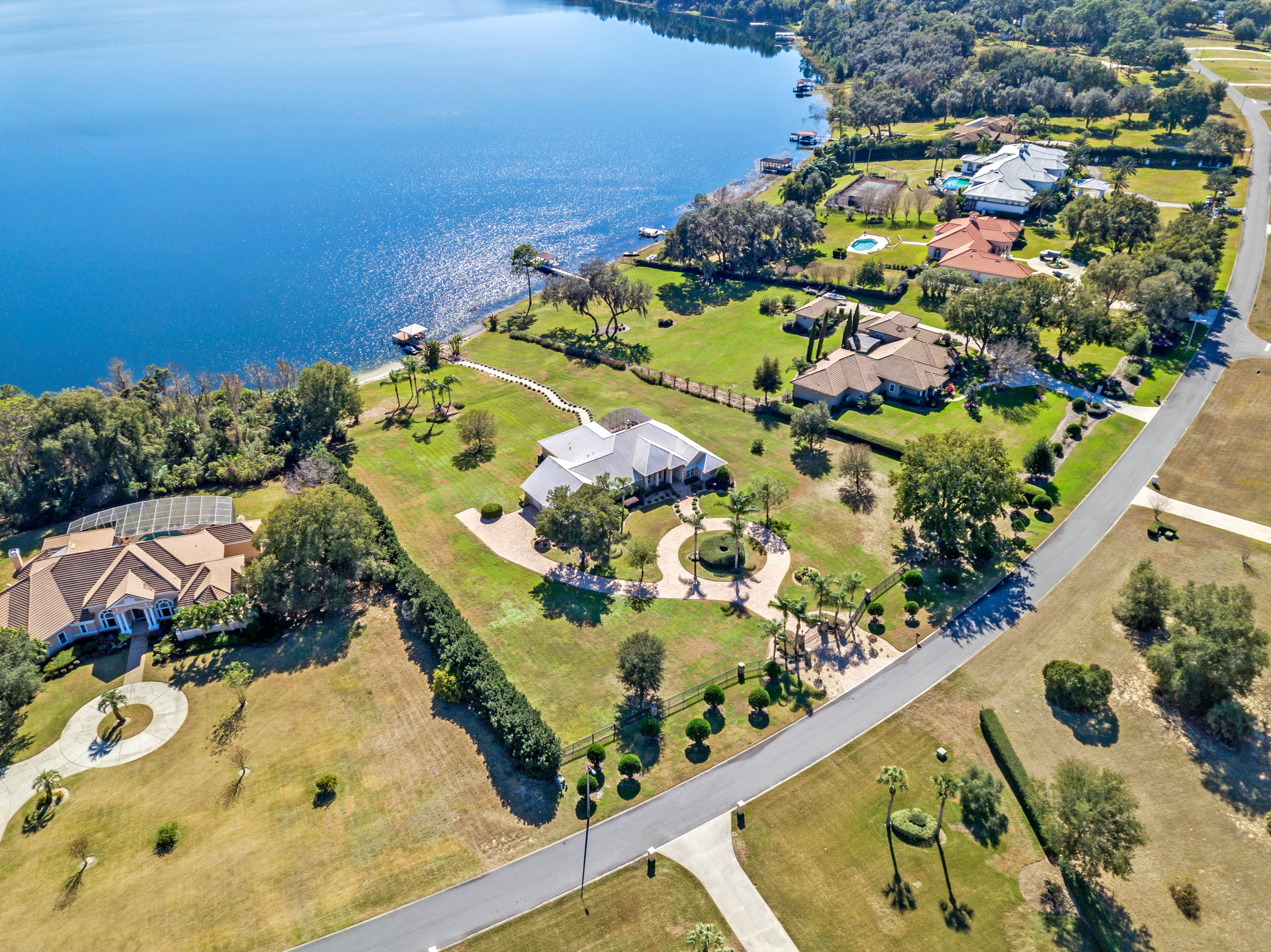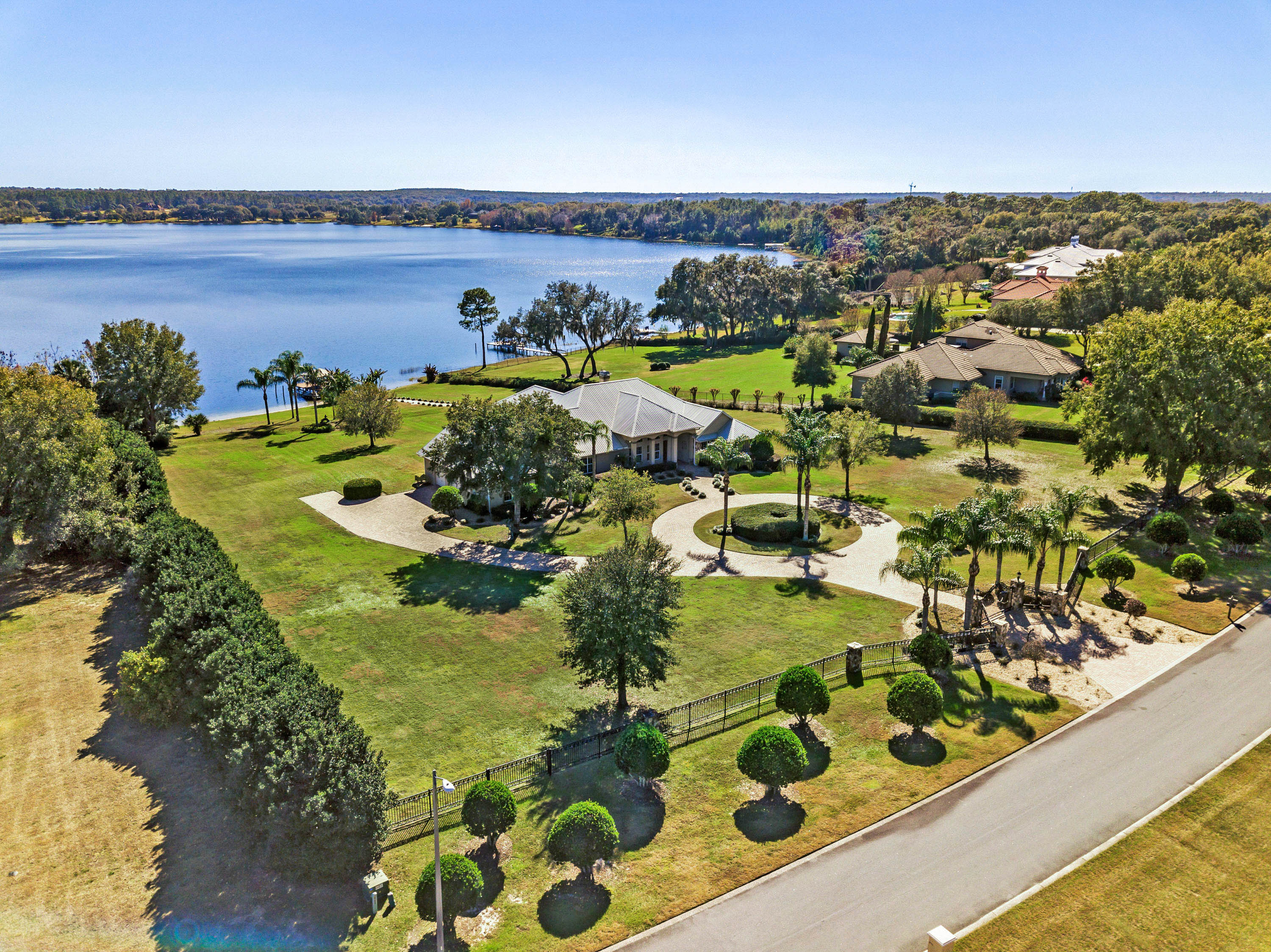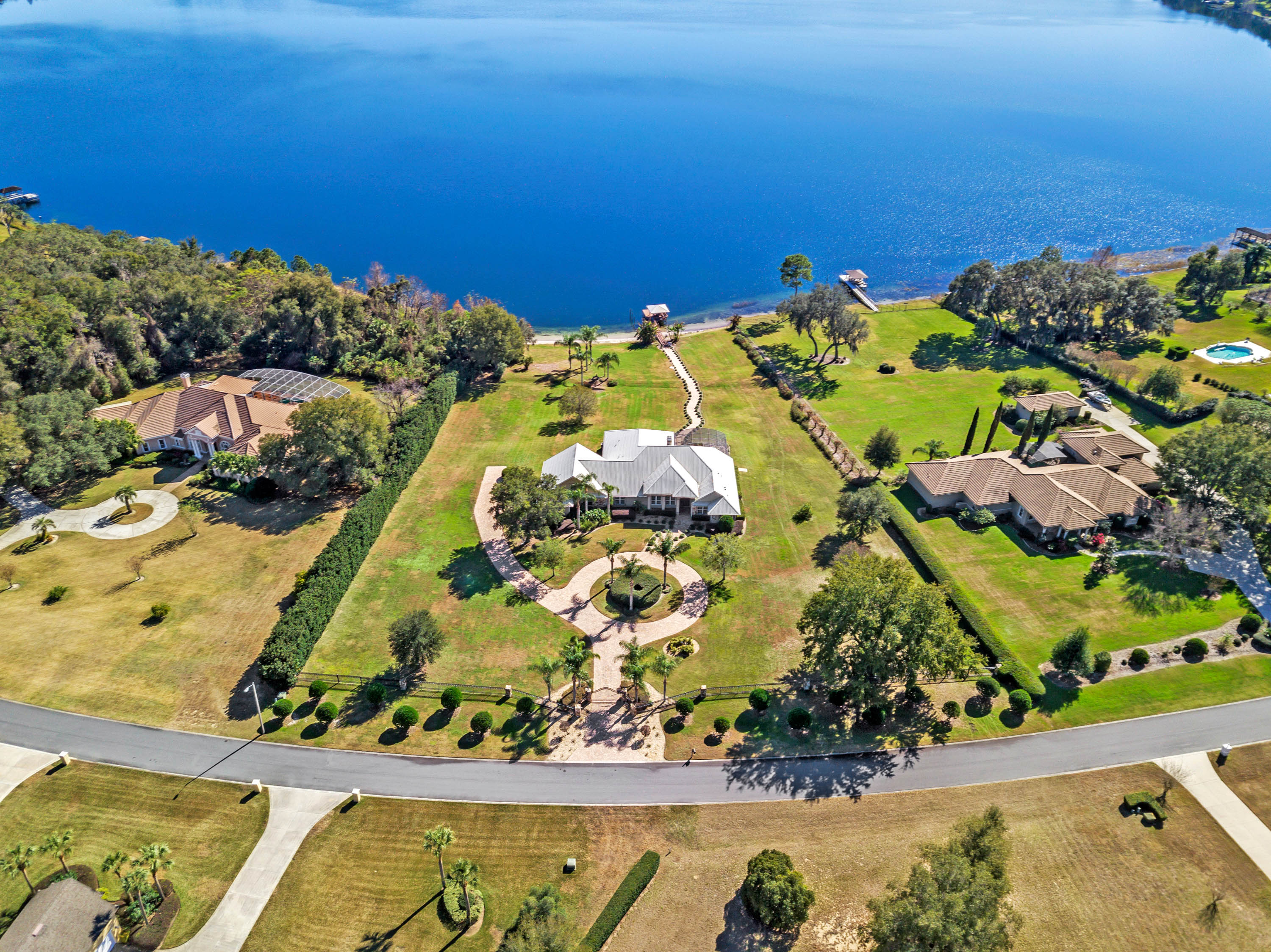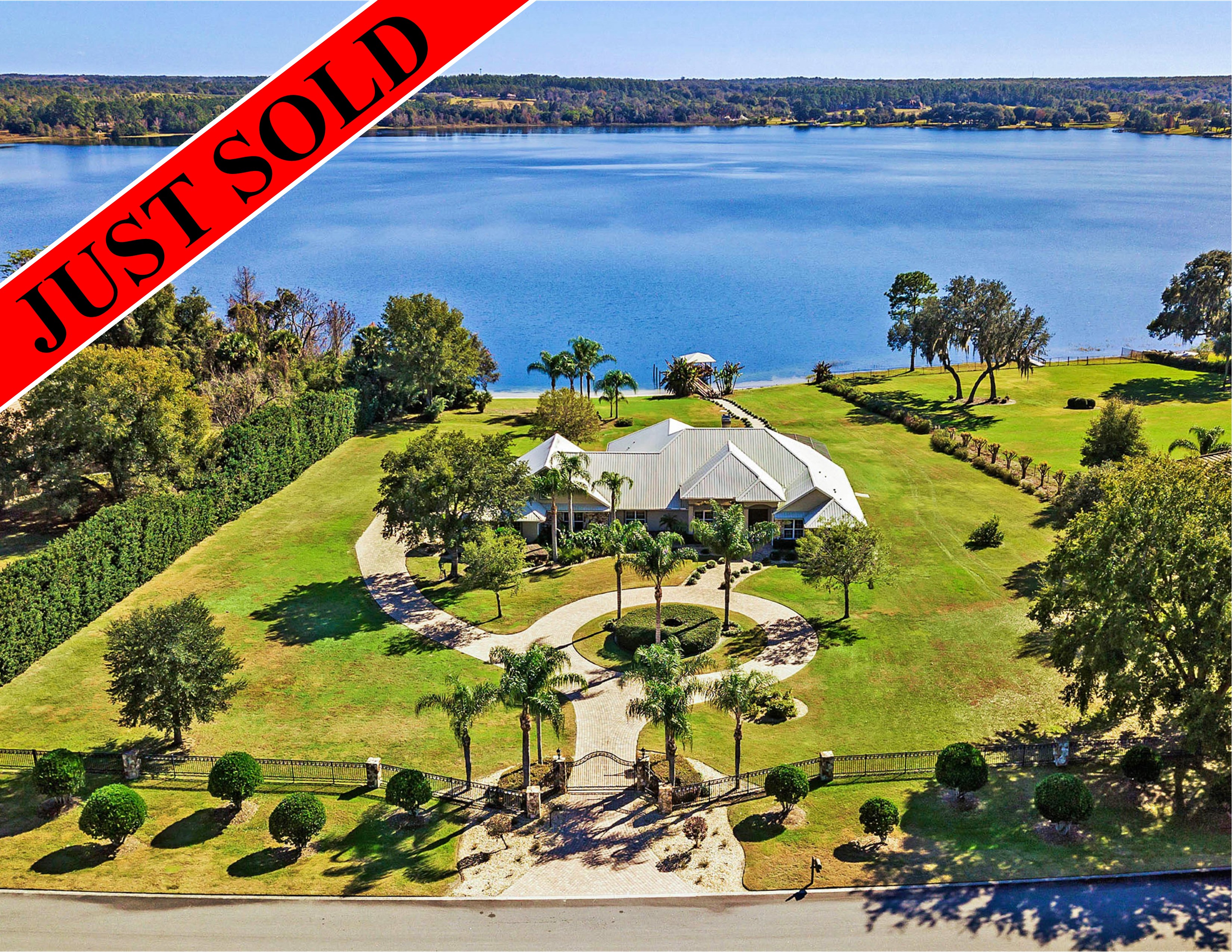 SOLD - Truly a Stunning Lakefront Masterpiece which proudly boasts nearly 4,500 sqft of beautifully appointed living area with 4 bedrooms (including 2 guest ensuites), 4.5 baths, separate living room, family room, bonus room, study-office, private security gate, over 3.75 acres of meticulously landscaped grounds, direct lake frontage on Lake Dalhousie with private dock & gazebo, oversized side entry garage (up to 4 vehicles), dramatic paver entrance & circular drive, as well screened paver swimming pool & lanai. Constructed with uncompromising standards for quality, attention to detail, and unparalleled aesthetic vision to maximize views of the lakefront panoramas for this premier and privileged setting. Boasting every imaginable custom designer appointment and inclusion, this exemplary waterfront offering features beautiful porcelain tile throughout all the main living areas; upstairs guest ensuite with solid wood floors; a Chef's Dream kitchen with granite counters, granite island, beautiful wood cabinetry and state-of-the-art built-in stainless appliances; downstairs master suite with views of the lake; bonus/game room; private dock and gazebo; remote controlled hurricane screening on lakeside windows; custom plantation shutters; and a seemingly infinite inventory of additional designer appointments, fixtures, niches, and decorative moldings. Conveniently located just minutes from downtown Mount Dora and Eustis shopping & dining. An absolute must see for any interested lakefront home buyer wanting quality, luxury, convenience, and a premier waterfront setting!!