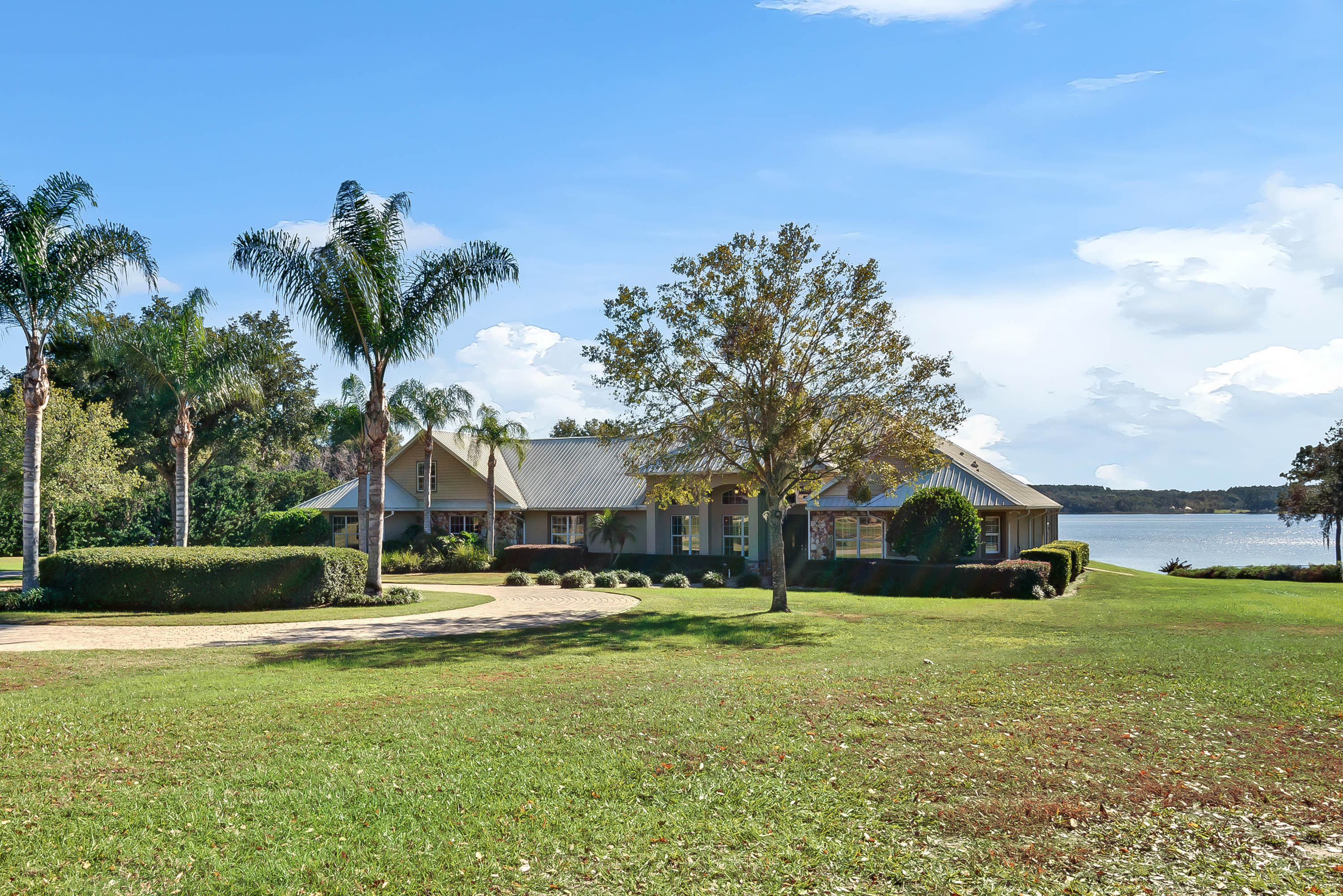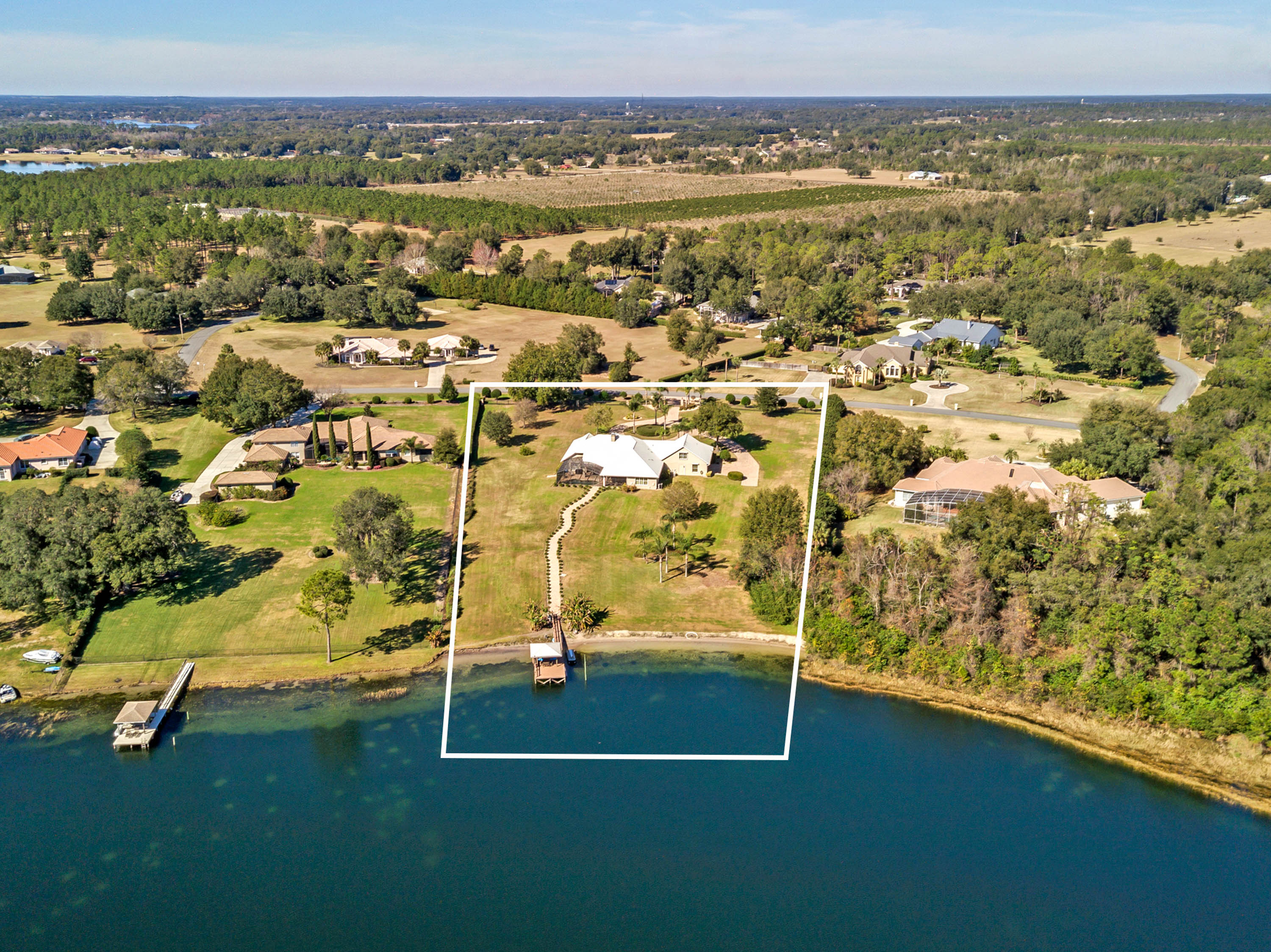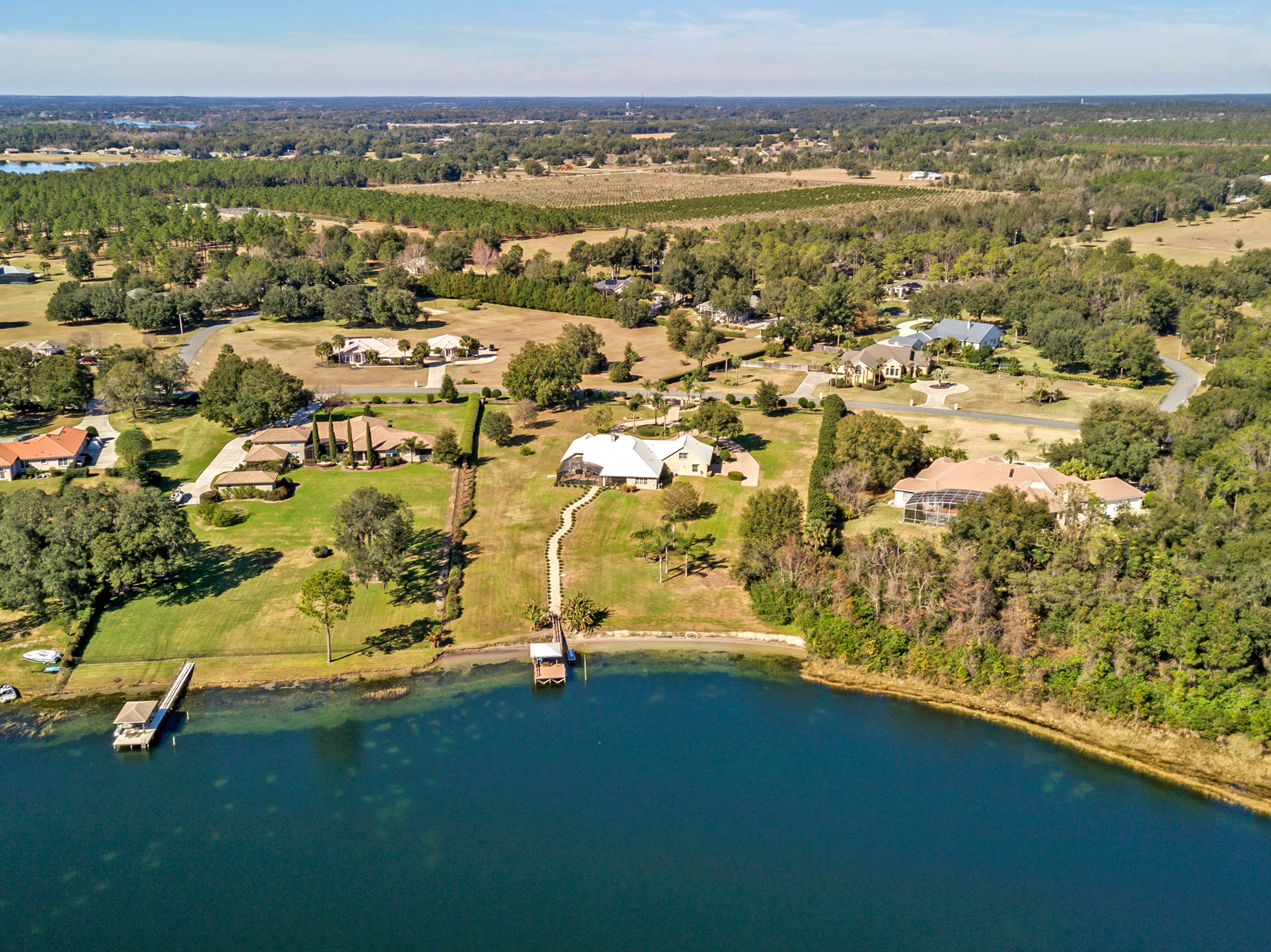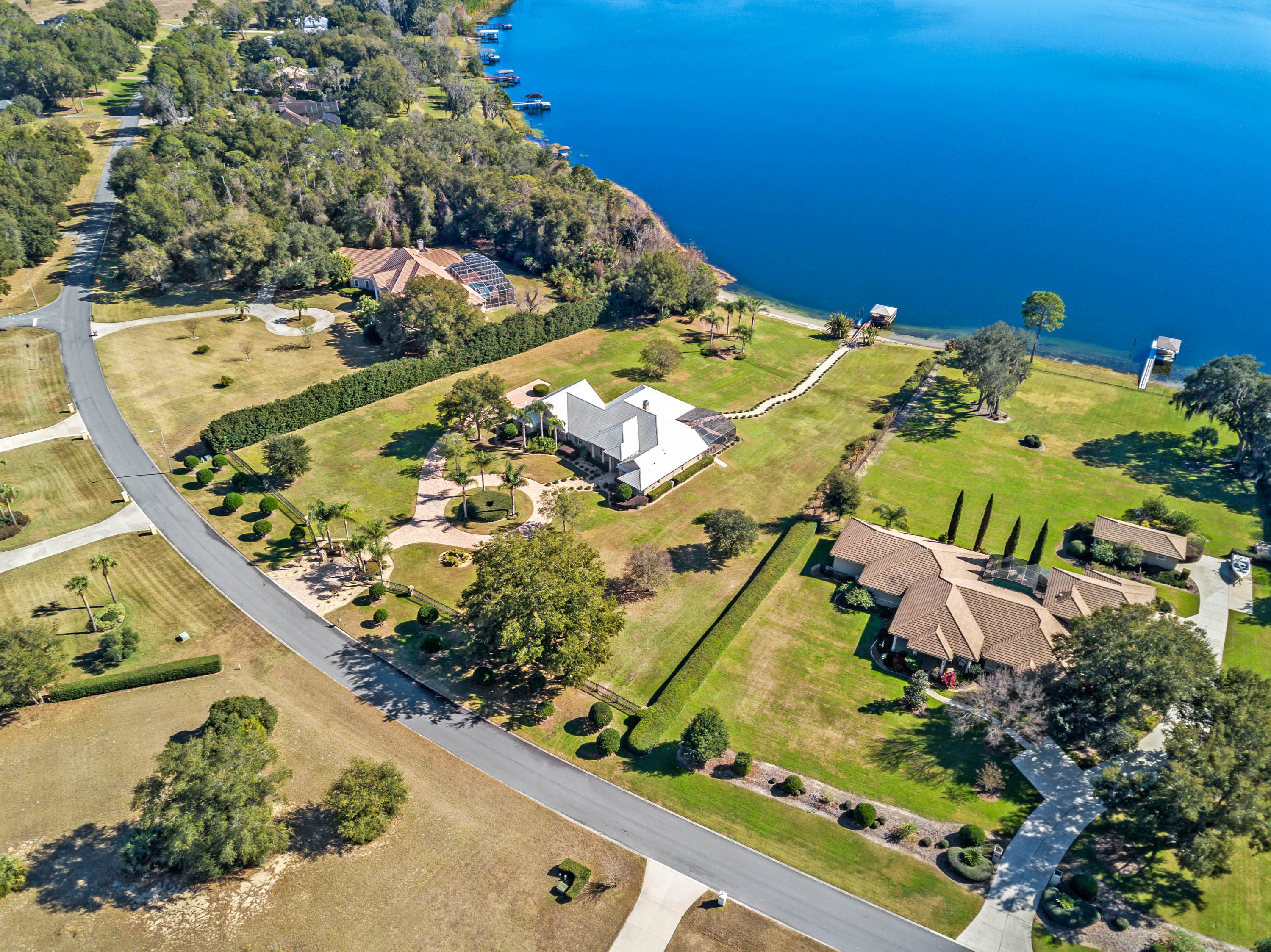 SOLD - Truly a Stunning Lakefront Masterpiece which proudly boasts nearly 4,500 sqft of beautifully appointed living area with 4 bedrooms (including 2 guest ensuites), 4.5 baths, separate living room, family room, bonus room, study-office, private security gate, over 3.75 acres of meticulously landscaped grounds, direct lake frontage on Lake Dalhousie with private dock & gazebo, oversized side entry garage (up to 4 vehicles), dramatic paver entrance & circular drive, as well screened paver swimming pool & lanai. Constructed with uncompromising standards for quality, attention to detail, and unparalleled aesthetic vision to maximize views of the lakefront panoramas for this premier and privileged setting. Boasting every imaginable custom designer appointment and inclusion, this exemplary waterfront offering features beautiful porcelain tile throughout all the main living areas; upstairs guest ensuite with solid wood floors; a Chef's Dream kitchen with granite counters, granite island, beautiful wood cabinetry and state-of-the-art built-in stainless appliances; downstairs master suite with views of the lake; bonus/game room; private dock and gazebo; remote controlled hurricane screening on lakeside windows; custom plantation shutters; and a seemingly infinite inventory of additional designer appointments, fixtures, niches, and decorative moldings. Conveniently located just minutes from downtown Mount Dora and Eustis shopping & dining. An absolute must see for any interested lakefront home buyer wanting quality, luxury, convenience, and a premier waterfront setting!!