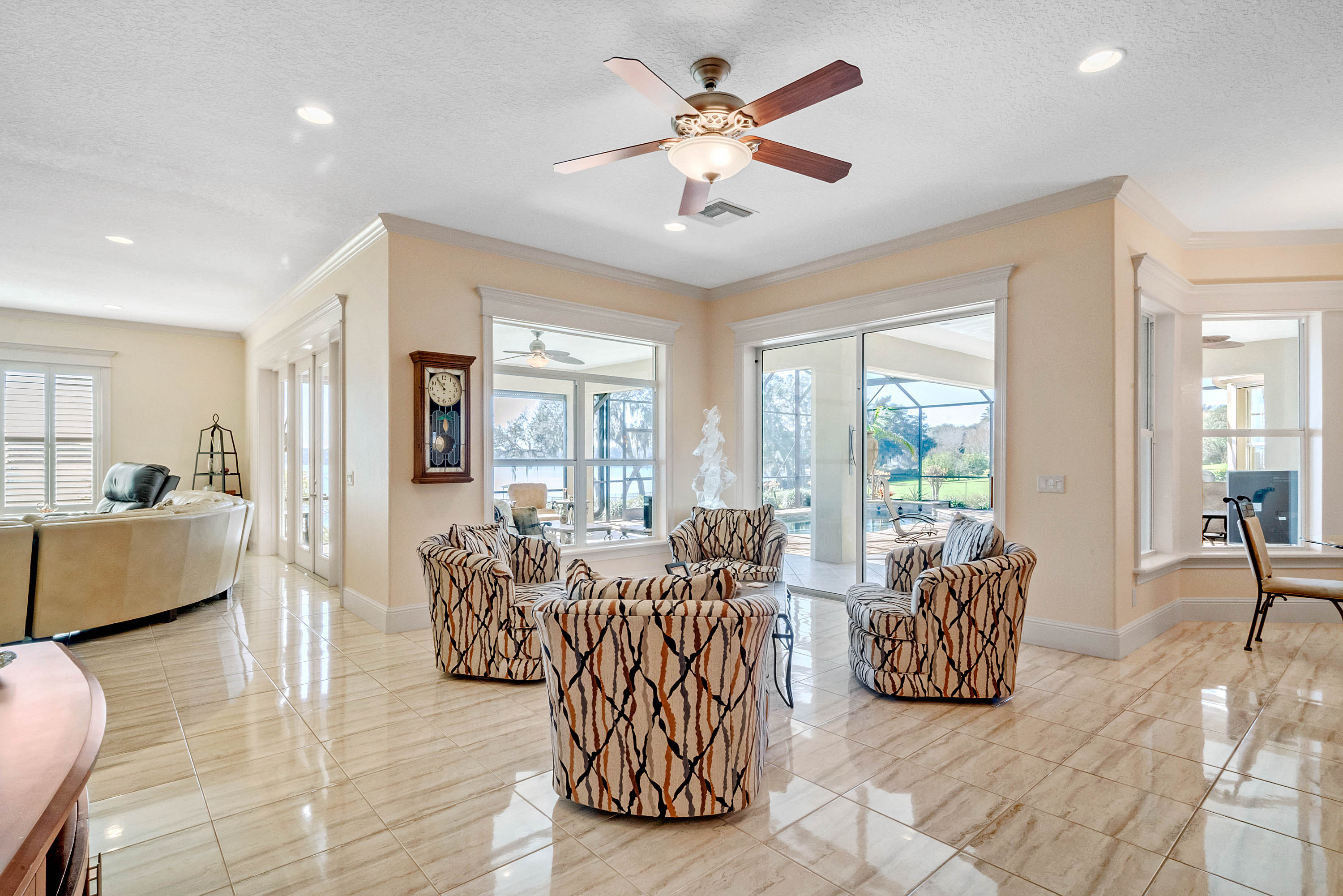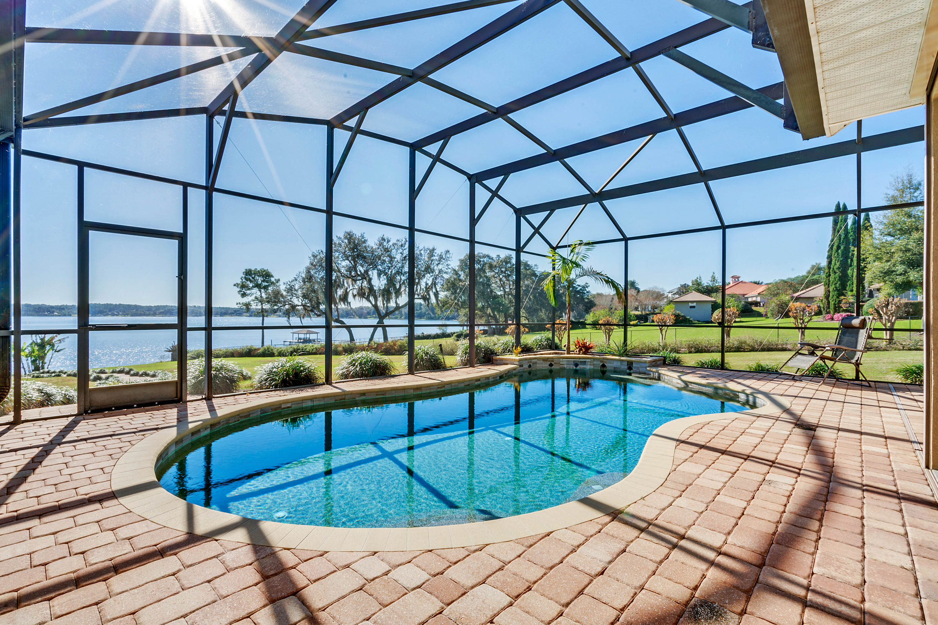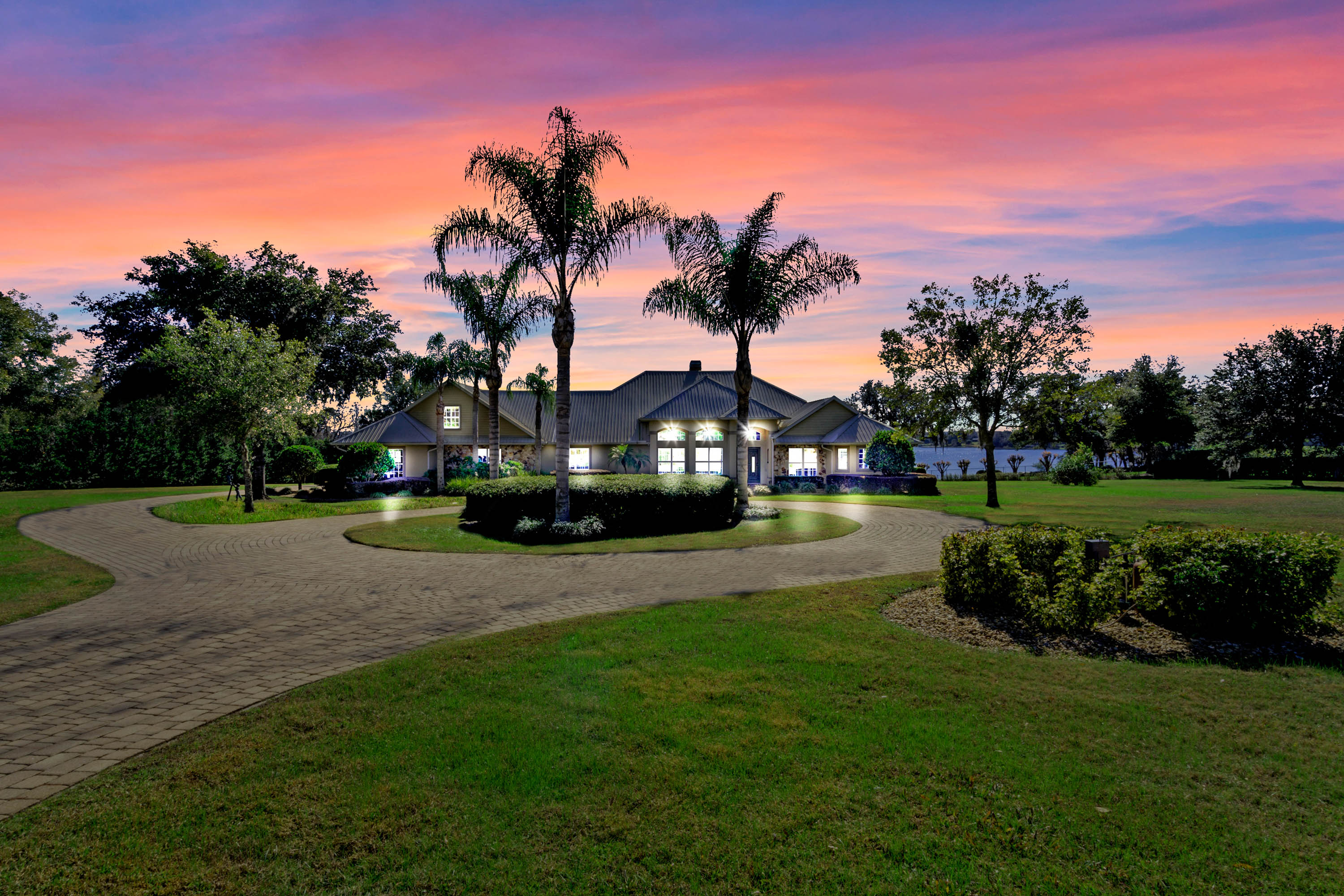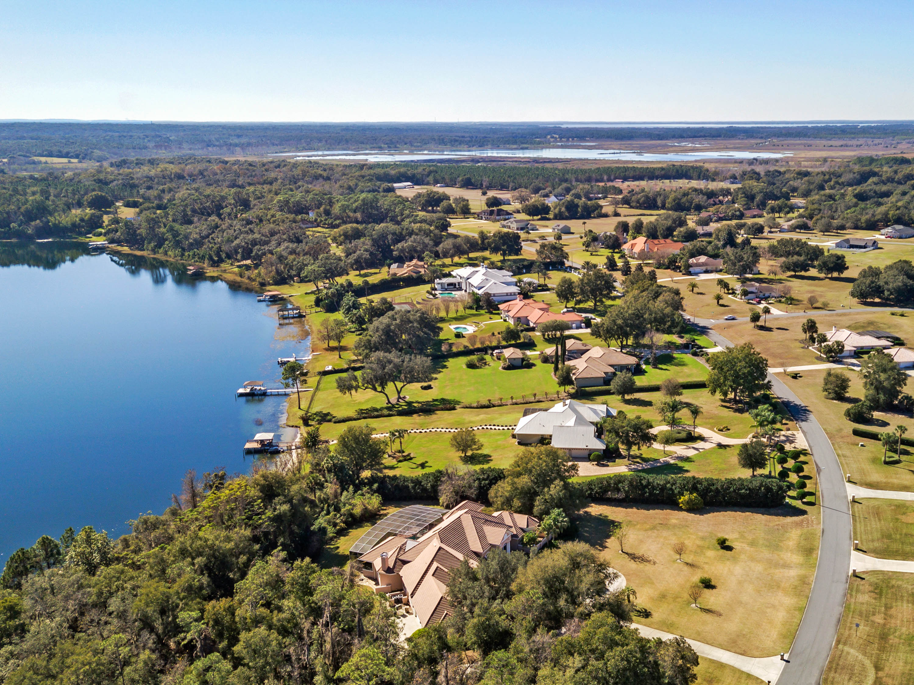 SOLD - Truly a Stunning Lakefront Masterpiece which proudly boasts nearly 4,500 sqft of beautifully appointed living area with 4 bedrooms (including 2 guest ensuites), 4.5 baths, separate living room, family room, bonus room, study-office, private security gate, over 3.75 acres of meticulously landscaped grounds, direct lake frontage on Lake Dalhousie with private dock & gazebo, oversized side entry garage (up to 4 vehicles), dramatic paver entrance & circular drive, as well screened paver swimming pool & lanai. Constructed with uncompromising standards for quality, attention to detail, and unparalleled aesthetic vision to maximize views of the lakefront panoramas for this premier and privileged setting. Boasting every imaginable custom designer appointment and inclusion, this exemplary waterfront offering features beautiful porcelain tile throughout all the main living areas; upstairs guest ensuite with solid wood floors; a Chef's Dream kitchen with granite counters, granite island, beautiful wood cabinetry and state-of-the-art built-in stainless appliances; downstairs master suite with views of the lake; bonus/game room; private dock and gazebo; remote controlled hurricane screening on lakeside windows; custom plantation shutters; and a seemingly infinite inventory of additional designer appointments, fixtures, niches, and decorative moldings. Conveniently located just minutes from downtown Mount Dora and Eustis shopping & dining. An absolute must see for any interested lakefront home buyer wanting quality, luxury, convenience, and a premier waterfront setting!!